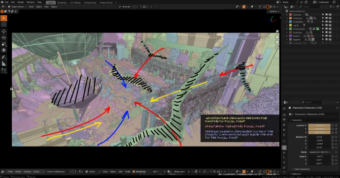 To bring this vision to life, I began the process by sketching out ideas and exploring different compositions to establish a strong narrative flow. Once I had a direction, I moved into Blender to block out the major shapes and refine the scene’s structure.